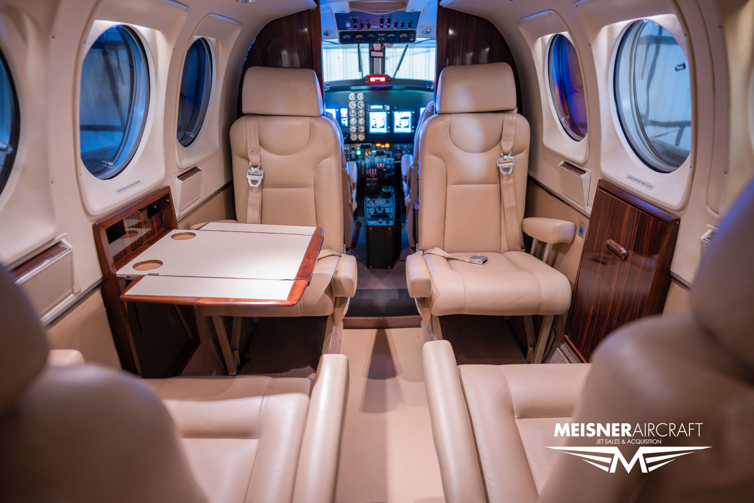 Six (6) passenger interior including a fwd club seating area, with a belted lavatory, with an aft auxiliary seat.
