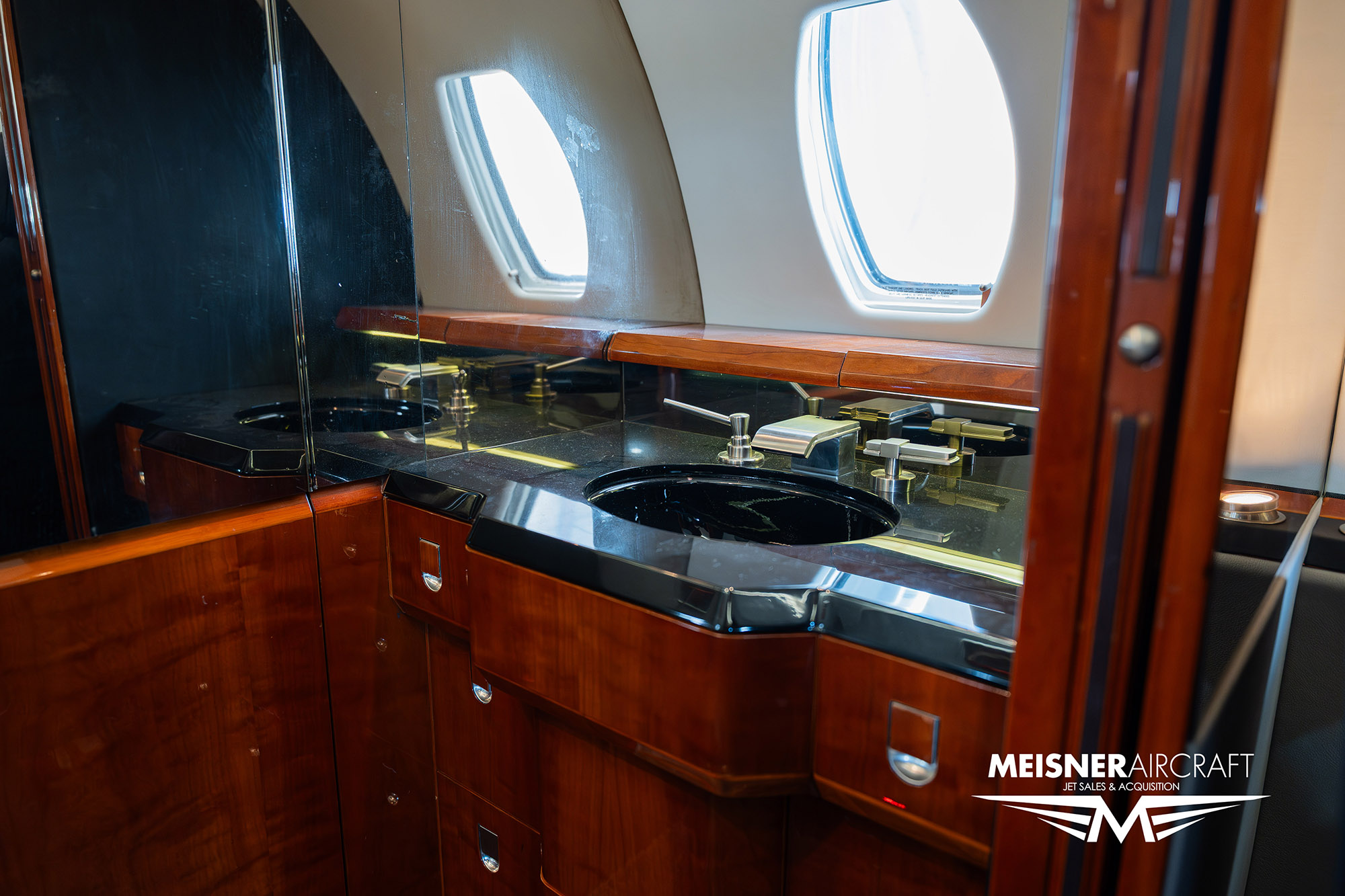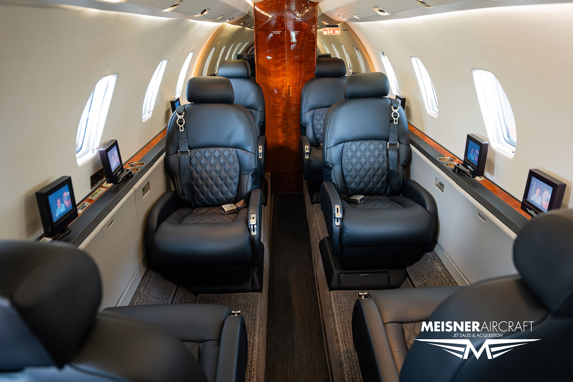 Executive eight (8) passenger seating includes a forward refreshment center. Seats are configured with a (2) two place divan, four (4) seats in a club arrangement, and two (2) forward facing aft seats. Individual display monitors are located at each cabin seat.