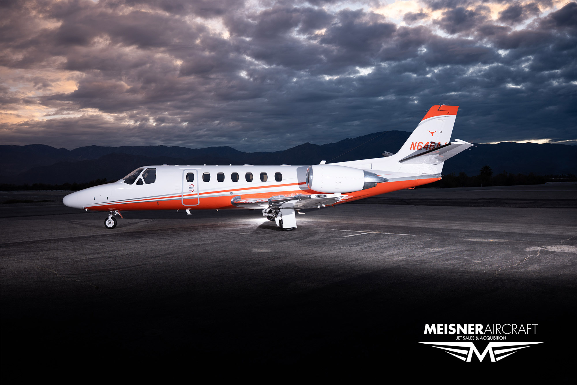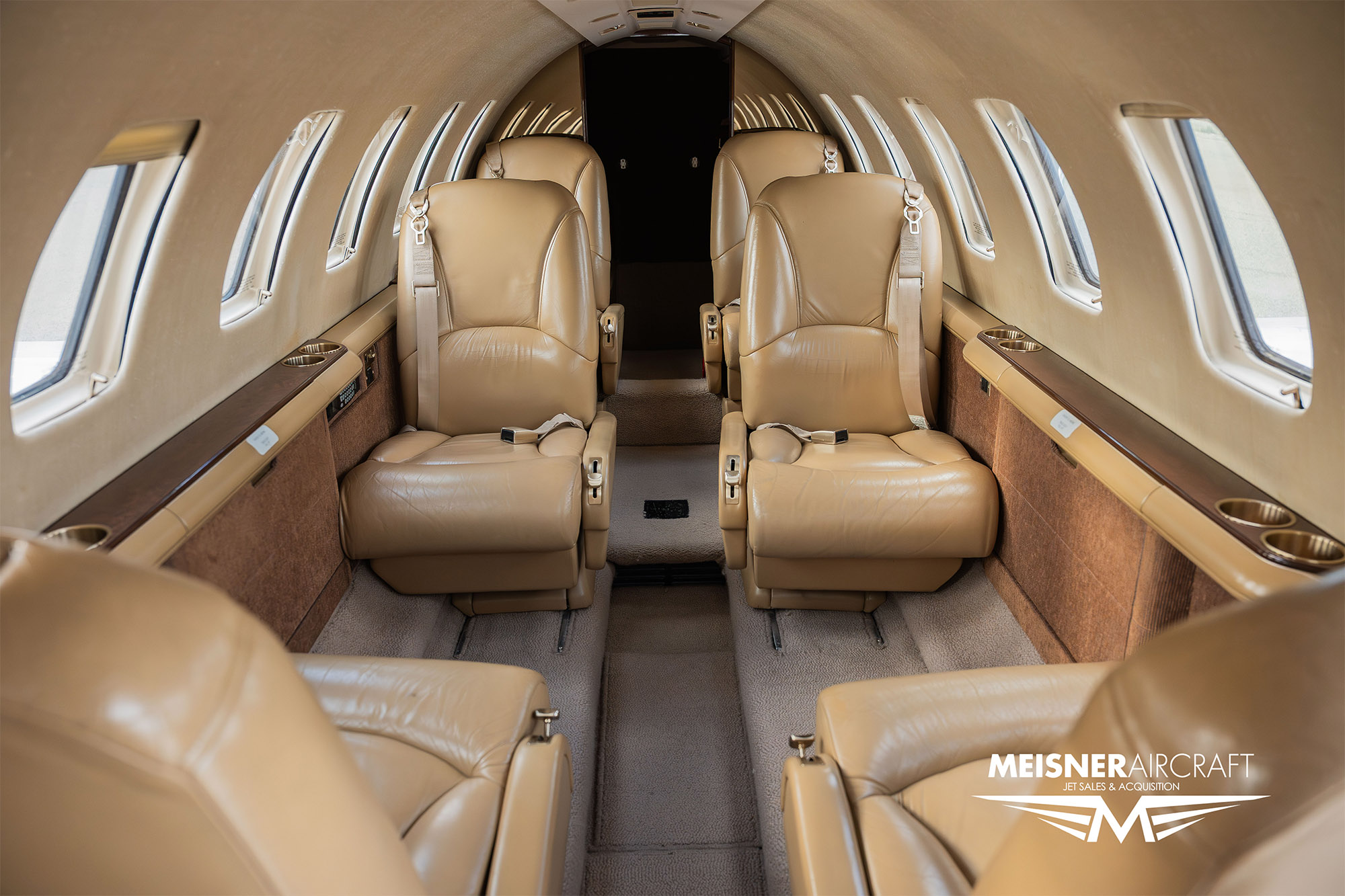 Seating for Eight (8) Passengers including a Belted Lavatory. Interior features Beige Leather, Wool Carpet, and Wood Veneer Cabinetry with a Hardwood Divider Lav Door for Full Privacy.